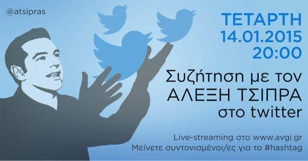 Με το hashtag #asktsipras οι χρήστες του Twitter ρωτούν τον αρχηγό του ΣΥΡΙΖΑ, Αλέξη Τσίπρα, για το πρόγραμμα του κόμματος του και την προοπτική ανάληψης κυβερνητικών καθηκόντων μετά τις εκλογές της 25ης Ιανουαρίου.