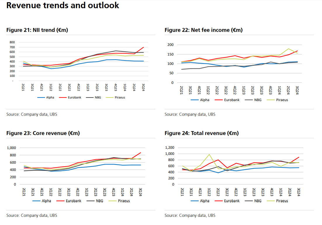 Τα περιθώρια επιτοκίων διατηρήθηκαν σε επίπεδα καλύτερα του αναμενομένου, με την παραγωγή NII να παραμένει ισχυρή (με την Eurobank να ενισχύεται από την εξαγορά της Ελληνικής Τράπεζας). Η αύξηση των δανείων επιταχύνθηκε (τα ενήμερα δάνεια στην Ελλάδα αυξήθηκαν κατά +6,7% ετησίως και τα εταιρικά δάνεια κατά +10,2% ετησίως). Το τρίτο τρίμηνο έκρυβε μια πρωτοβουλία για την επιτάχυνση της πληρωμής των DTCs, η οποία ανοίγει τον δρόμο για υψηλότερες διανομές μερισμάτων, τόσο για το οικονομικό έτος 2024 όσο και για το μέλλον. «Η επενδυτική θέση μας παραμένει ισχυρή παρά την κάπως ταχύτερη μείωση των επιτοκίων. Εξακολουθούμε να βλέπουμε σημαντική δυναμική για περαιτέρω ανατιμήσεις, με τις αυξημένες διανομές να αποτελούν βασικό καταλύτη» σημειώνει η UBS.