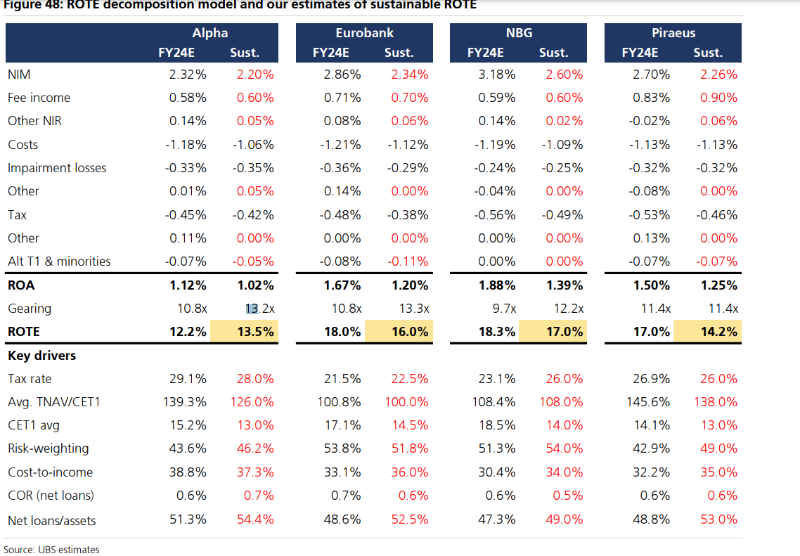 «Αναμένουμε σχετικά σταθερά ROTE από το 2023 έως το 2026, αν και με κάποια μείωση από την υψηλή βάση του 2025, ιδιαίτερα για την ΕΤΕ και την Πειραιώς. Σε ένα περιβάλλον χαμηλότερων επιτοκίων, τα ROAs αναμένεται να εξομαλυνθούν, με παράλληλη δυνατότητα αύξησης διανομών, οδηγώντας σε βιώσιμα ROTE της τάξης του 13,5% για την Alpha, 16,0% για την Eurobank, 17,0% για την ΕΤΕ και 14,2% για την Πειραιώς» λέει η τράπεζα.