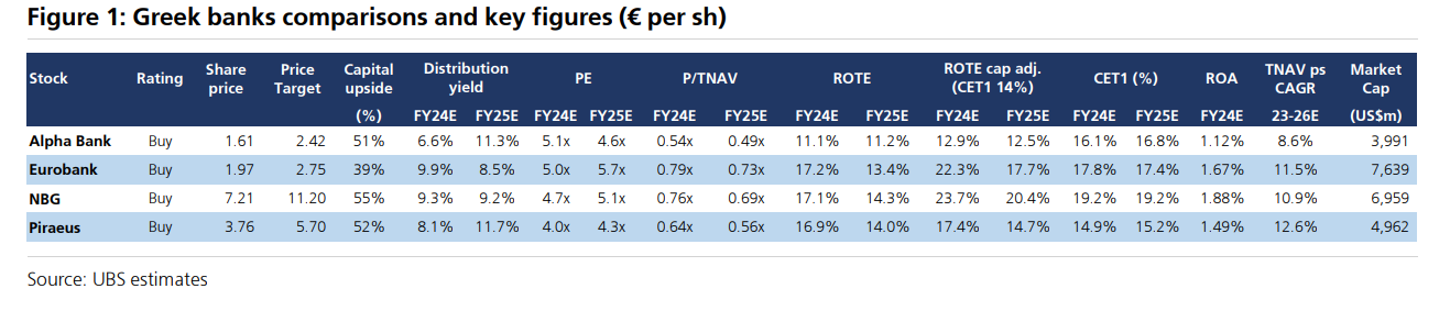 Σε αυτό το πλαίσιο, η UBS αναβαθμίζει τις εκτιμήσεις της για το EPS του 2024 κατά 1% έως 5%, ενσωματώνοντας τις επαναγορές μετοχών, οι οποίες αυξάνουν τις εκτιμήσεις EPS για το 2026 κατά 3% έως 6%. Μειώνει ελαφρώς τις προβλέψεις της για το 2025 για την ΕΤΕ (-2%) και τη Eurobank (-2%). «Τα μεσοπρόθεσμα σχέδια θα επικαιροποιηθούν στα αποτελέσματα του τέταρτου τριμήνου, αλλά πιστεύουμε ότι οι αρχικές κατευθύνσεις για το 2026 είναι πιθανό να διατηρηθούν παρά τα χαμηλότερα επιτόκια. Η Alpha Bank είχε πολύ χαμηλή αποτίμηση, με αποτέλεσμα οι μετοχές της να αυξηθούν κατά 13% μετά τα αποτελέσματα της περασμένης εβδομάδας, αν και εξακολουθεί να εμφανίζει σημαντική δυναμική σε σχέση με την τιμή στόχο μας. Συνεχίζουμε να βλέπουμε δυναμική για ανατιμήσεις στον κλάδο, με τις αποδόσεις διανομών να αυξάνονται» καταλήγει η UBS.