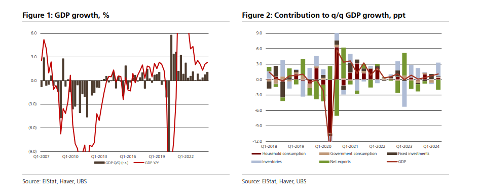 Πυλώνας 1: Σύμφωνα με τη UBS, τα εισερχόμενα δεδομένα παραμένουν συνεπή με τις εκτιμήσεις για ανάπτυξη 2,5% το 2024 Το περασμένο έτος η οικονομική ανάπτυξη απέτυχε να φτάσει τις επίσημες προβλέψεις κυρίως λόγω: α) καθυστερήσεων στην απορρόφηση κεφαλαίων της ΕΕ και β) των επιπτώσεων των φυσικών καταστροφών που συνέβησαν στον θεσσαλικό κάμπο. Φέτος, ωστόσο, τα εισερχόμενα στοιχεία παραμένουν συνεπή με την πρόβλεψή για ΑΕΠ στο ύψος του 2,5%, που είναι 60 μονάδες βάσης πάνω από τη συναίνεση και 30 μονάδες βάσης πάνω από την τελευταία (και προς τα κάτω αναθεωρημένη) επίσημη εκτίμηση της κυβέρνησης για 2,2%.