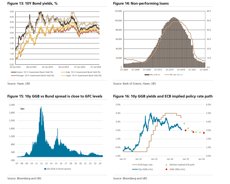 Επίσης, η επιτάχυνση των μειώσεων των επιτοκίων από την Ευρωπαϊκή Κεντρική Τράπεζα και τη Fed αναμένεται να στηρίξει τη διάρκεια των ευρωπαϊκών ομολόγων και τους ελληνικούς τίτλους. Ο στόχος της UBS για το τέλος του έτους είναι μια απόδοση 3% για τα ελληνικά ομόλογα και 2,7% έως το τέλος του 2025.