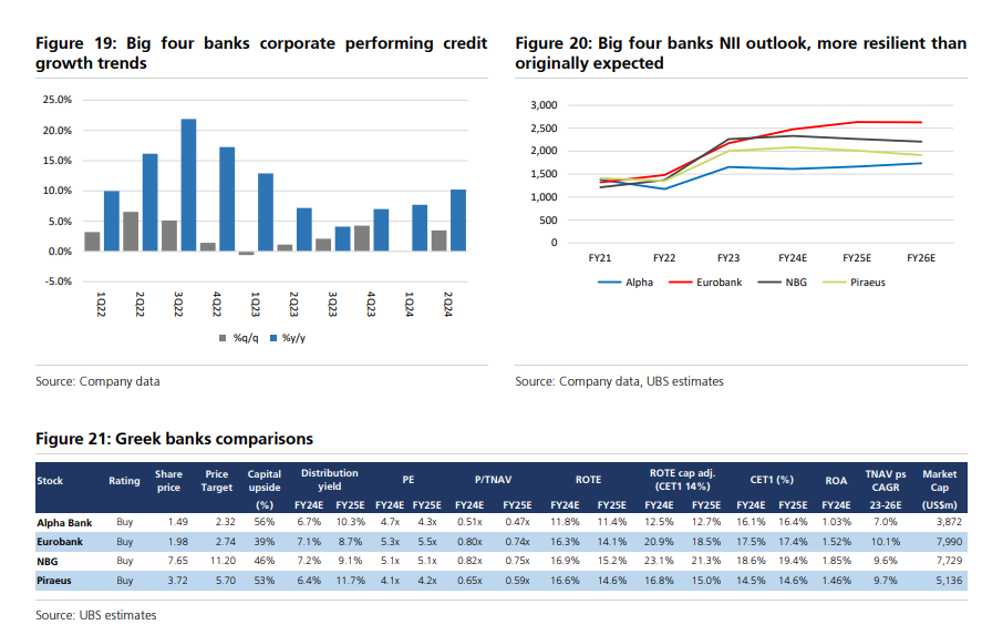 Δεύτερον, οι τράπεζες είναι μεγάλοι ωφελούμενοι από έναν ισχυρό εταιρικό πιστωτικό κύκλο, με τη UBS να προβλέπει ότι η απόδοση της εταιρικής πίστης θα αυξηθεί κατά 8,7% ετησίως, όπως αποκάλυψαν και τα αποτελέσματα του δεύτερου τριμήνου. Αυτό σε συνδυασμό με τα επιτοκιακά περιθώρια (NIM) να διατηρούνται καλύτερα από το αναμενόμενο (αντιστάθμιση και χαμηλότερα για beta κατάθεσης μεγαλύτερης διάρκειας) θα οδηγήσει σε πιο ανθεκτική παραγωγή επιτοκιακών εσόδων (NII) από ό,τι αναμενόταν από την αγορά.