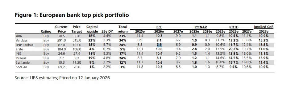 Σε αυτό το πλαίσιο, το χαρτοφυλάκιο European bank top picks της UBS περιλαμβάνει τις ABN AMRO, Barclays, BNP Paribas, Erste Group, ING, Santander, Société Générale, καθώς και την Τράπεζα Πειραιώς, η οποία λειτουργεί κατά τη UBS ως το βασικό στοίχημα για στοχευμένη έκθεση στην ελληνική τραπεζική αγορά.