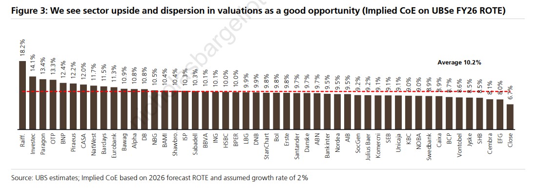 Τα παραπάνω συνάδουν με το γεγονός πως η UBS εκτιμά το κόστος ιδίων κεφαλαίων (implied CoE) για το 2026 ως εξής: Πειραιώς 12,2%, Eurobank 11,3%, Alpha 10,8% και Εθνική 10,5%, επιβεβαιώνοντας τη θετική δυναμική και τη δυνατότητα για υπερβάλλουσες αποδόσεις.