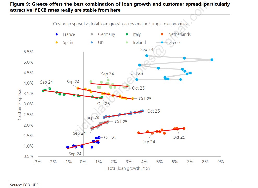 Η έκθεση τονίζει ότι οι επενδυτές αναζητούν αγορές με ισχυρή αύξηση δανείων και ευνοϊκά περιθώρια κέρδους, τομείς στους οποίους η Ελλάδα υπερέχει, και επενδύουν με τη βεβαιότητα ότι η ΕΚΤ θα παραμείνει σε στάση αναμονής στο προβλέψιμο μέλλον.