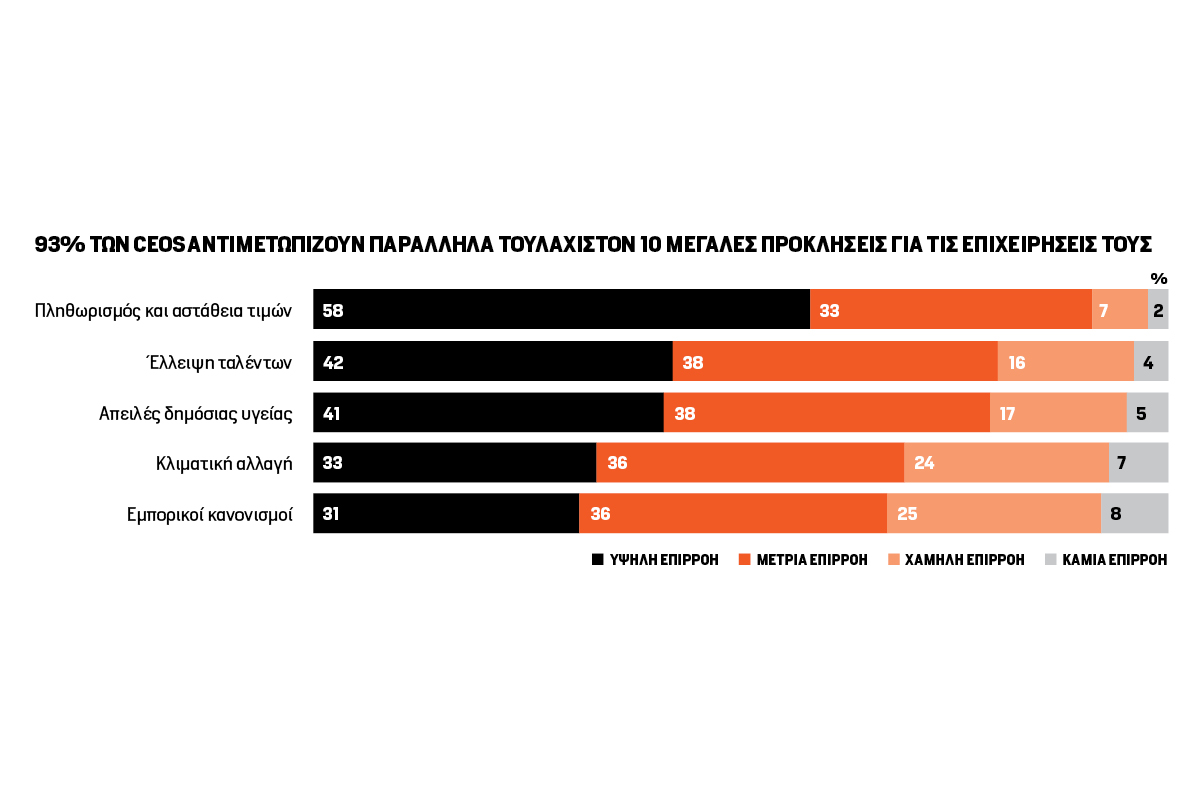 Οι διευθύνοντες σύµβουλοι ανά τον κόσµο αντιµετωπίζουν έναν τεράστιο αριθµό προκλήσεων, µε τη συντριπτική πλειονότητα αυτών (93%) να αντιµετωπίζουν 10 ή και περισσότερες µεγάλες προκλήσεις ταυτόχρονα για τις επιχειρήσεις τους. Παράλληλα, 87% αυτών προειδοποιούν ότι οι διαρκείς αναταραχές υποσκάπτουν την υλοποίηση των Στόχων Βιώσιµης Ανάπτυξης του ΟΗΕ (SDGs), σύµφωνα µε τη µεγαλύτερη µελέτη για τη βιωσιµότητα σε επίπεδο CEOs που έχει πραγµατοποιηθεί διαχρονικά από το UN Global Compact και την Accenture. Συγκεκριµένα, ενώ οι CEOs προβληµατίζονται ολοένα και περισσότερο για τις διαρκείς αναταραχές, σχεδόν όλοι (98%) συµφωνούν ότι η βιωσιµότητα βρίσκεται στον πυρήνα του ρόλου τους − µια διαπίστωση που έχει σηµειώσει αύξηση 15 ποσοστιαίων µονάδων τα τελευταία 10 χρόνια της µελέτης.