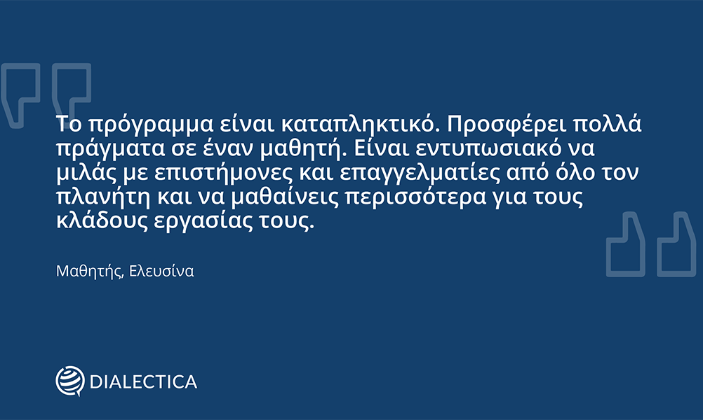 Η Dialectica, μια από τις ταχύτερα αναπτυσσόμενες εταιρείες στην Ελλάδα και το εξωτερικό, παρουσιάζει το πρόγραμμα “Unexplored Futures” σε.συνεργασία με τον Μη Κερδοσκοπικό Οργανισμό, The Tipping Point. Στόχος του προγράμματος μέχρι το τέλος του χρόνου είναι η ενημέρωση 500+ μαθητών από όλη την Ελλάδα για τις ανεξερεύνητες ευκαιρίες και επιλογές στην αγορά εργασίας με σκοπό να λάβουν πιο συνειδητοποιημένα αποφάσεις για το επαγγελματικό τους μέλλον.