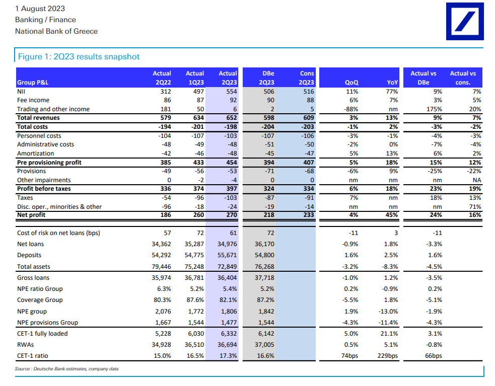 Ειδικότερα, τα καθαρά κέρδη της Εθνικής Τράπεζας ξεπέρασαν αισθητά τις εκτιμήσεις (κατά +16%). Προς αυτή την κατεύθυνση, λέει η Deutsche Bank, συνεισέφεραν σχεδόν όλες οι κατευθύνσεις, ωστόσο μεγάλη ήταν η συμβολή κυρίως των καθαρών εσόδων από τόκους (NII) αλλά και οι χαμηλότερες προβλέψεις επί επισφαλειών.