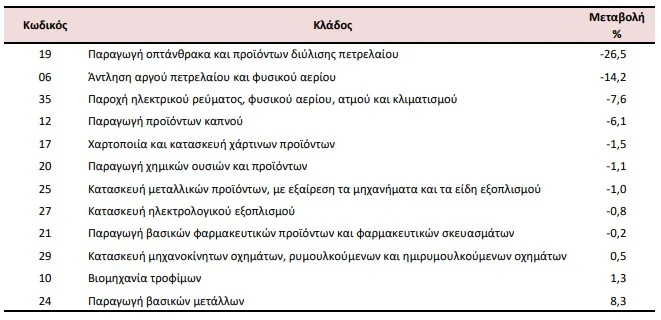 Στη μείωση του Γενικού Δείκτη Τιμών Εισαγωγών (σύνολο αγοράς) κατά 4,6% συνέβαλαν κυρίως οι μεταβολές των δεικτών