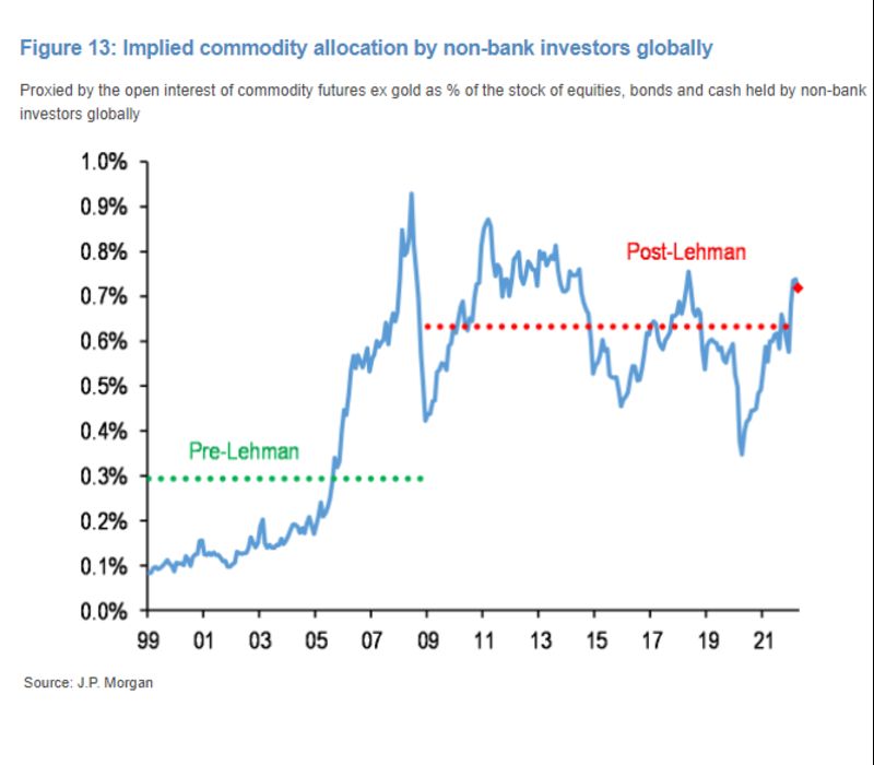 «Στην τρέχουσα συγκυρία, όπου η ανάγκη για αντιστάθμιση πληθωρισμού είναι πιο αυξημένη, είναι δυνατόν να δούμε τις τοποθετήσεις στην αγορά εμπορευμάτων να αυξάνονται πάνω από το 1% επί των συνολικών χρηματοοικονομικών στοιχείων ενεργητικού παγκοσμίως, ξεπερνώντας τα προηγούμενα υψηλά», έγραψαν οι αναλυτές της JPMorgan τον Απρίλιο. 6 σημ. Υπό προϋποθέσεις, αυτό «θα σήμαινε 30% έως 40% αύξηση», κατέληξαν.