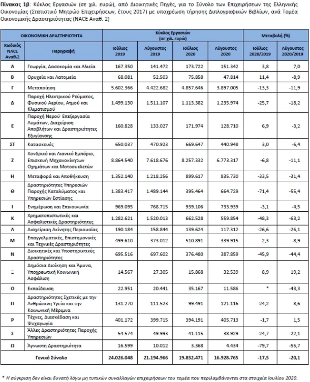 Με βάση αυτά τα στοιχεία, ο κύκλος εργασιών τον Αύγουστο 2020 ανήλθε σε 16.928.765 χιλ. ευρώ, σημειώνοντας μείωση 20,1% σε σχέση με τον Αύγουστο 2019, που ήταν 21.194.966 χιλ. ευρώ. Τη μεγαλύτερη μείωση στον κύκλο εργασιών κατά 63,2% τον Αύγουστο 2020 σε σύγκριση με τον Αύγουστο 2019 παρουσίασαν οι επιχειρήσεις του τομέα Χρηματοπιστωτικές και Ασφαλιστικές Δραστηριότητες, ενώ ξενοδοχεία και εστίαση καταγράφουν πτώση 55%. Τη μικρότερη μείωση στον κύκλο εργασιών παρουσίασαν οι επιχειρήσεις του τομέα Παροχή Νερού, Επεξεργασία Λυμάτων, Διαχείριση Αποβλήτων και Δραστηριότητες Εξυγίανσης κατά 3,2%