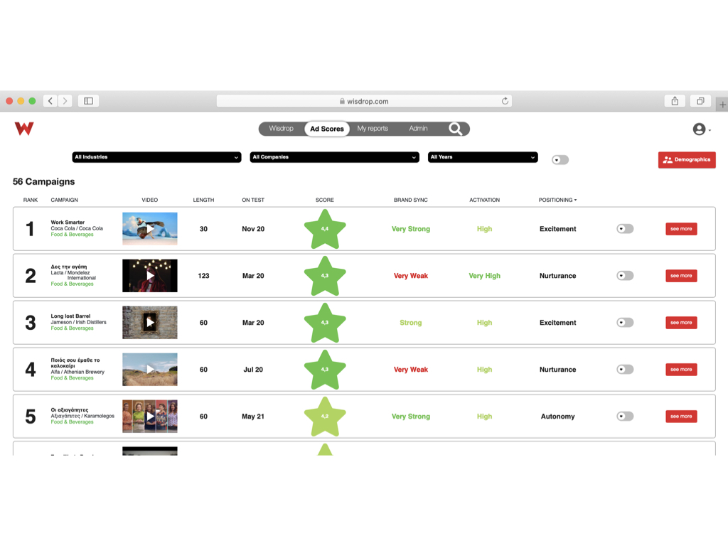 Η 2η ενότητα φιλοξενεί τα Ad Scores. Πρόκειται για μια ποσοτική αξιολόγηση των πιο ενδιαφέροντων διαφημιστικών καμπανιών που βρίσκονται στον αέρα, με βάση τη μεθοδολογία που χρησιμοποιεί η Braincandy. Η μεθοδολογία αυτή εστιάζει στην συναισθηματική απήχηση κάθε τηλεοπτικού spot, ενώ προσφέρει πλούσια πληροφόρηση τόσο για τα βραχυπρόθεσμα, όσο και για τα μακροπρόθεσμα αποτελέσματα μιας καμπάνιας. Κάθε χρόνο θέτονται υπό διερεύνηση πάνω από 40 διαφημίσεις, τα αποτελέσματα των οποίων συγκεντρώνονται αθροιστικά στην ενότητα των Ad Scores και στα οποία έχουν πρόσβαση οι συνδρομητές της υπηρεσίας. Σκοπός αυτού του εργαλείου είναι να βοηθήσει τις εταιρείες αλλά και τις διαφημιστικές τους, να κατανοήσουν εκείνα τα στοιχεία που τραβούν το ενδιαφέρον των θεατών, ανεξάρτητα από το προϊόν ή τον κλάδο που διαφημίζεται, και να τα αξιοποιήσουν προς όφελος του brand τόσο σε βραχυπρόθεσμο, όσο και σε μακροπρόθεσμο επίπεδο. Για παράδειγμα, ποιες καμπάνιες σκοράρουν καλύτερα στο νεανικό κοινό; Οι αστείες ή οι πιο «συναισθηματικές»;