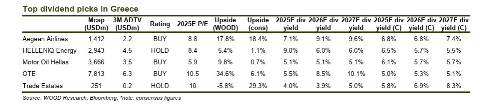 • HELLENiQ Energy (HOLD, τιμή στόχος 8,8 ευρώ): Ολοκληρωμένος ενεργειακός όμιλος υψηλής απόδοσης, με προβλεπόμενο μερισματικό yield περίπου 9% για το 2025E, που μετριάζεται ελαφρώς το 2026-27. Σταθερές λειτουργίες διύλισης, παραγωγή μετρητών και πειθαρχημένη κατανομή κεφαλαίων υποστηρίζουν ένα βιώσιμο μερισματικό προφίλ, γεγονός που καθιστα τον όμιλο έναν από τους σημαντικότερους σε απόδοση στην Ελλάδα.