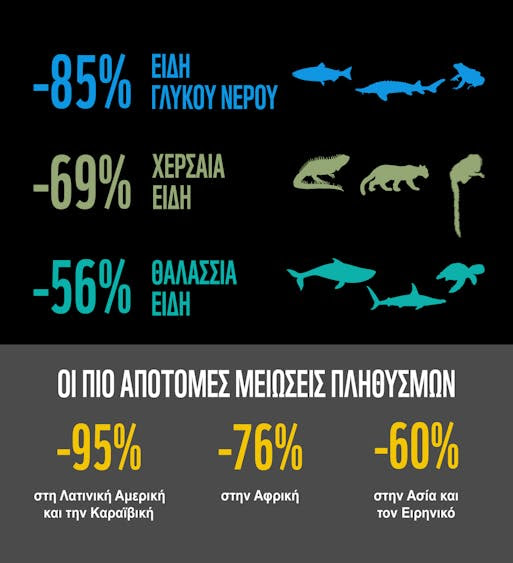 Στην τελευταία έκδοση, καταγράφεται μια κατακόρυφη μείωση κατά 73% στους πληθυσμούς άγριας ζωής παγκοσμίως. Συγκεκριμένα, η μεγαλύτερη μείωση καταγράφεται στους πληθυσμούς των ειδών που συναντώνται σε οικοσυστήματα εσωτερικών υδάτων (-85%), ενώ ακολουθούν οι πληθυσμοί των ειδών στα χερσαία (-69%) και κατόπιν, στα θαλάσσια οικοσυστήματα (-56%). Οι τάσεις αυτές διαφέρουν μεταξύ των διαφόρων περιοχών του κόσμου, με πιο απότομες μειώσεις να παρατηρούνται στη Λατινική Αμερική και την Καραϊβική, όπου έχει καταγραφεί μια ανησυχητική μείωση κατά 95%, την Αφρική (-76%) και την περιοχή Ασία-Ειρηνικός (-60%). Αντίθετα, στην Ευρώπη, την Κεντρική Ασία και τη Βόρεια Αμερική, οι εκτεταμένες επιπτώσεις στη φύση ήταν ήδη εμφανείς πριν από την έναρξη των μετρήσεων του δείκτη το 1970, με αποτέλεσμα να είχαν ξεκινήσει πιο άμεσα δράσεις προστασίας. Και γι’ αυτόν τον λόγο, η έκθεση δείχνει πως οι επιπτώσεις στη φύση σε αυτές τις περιοχές είναι ηπιότερες.