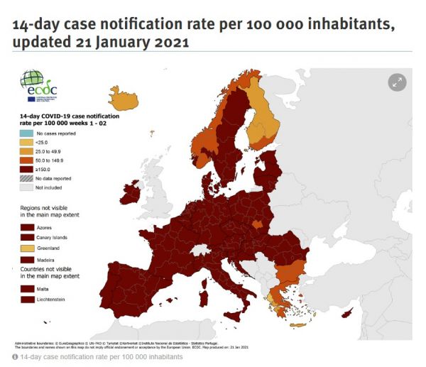 Να σημειωθεί ότι το ECDC δεν συλλέγει στοιχεία για τη Βρετανία, την Ελβετία, τις βαλκανικές χώρες (εκτός εκείνων που είναι μέλη της ΕΕ), την Ουκρανία, τη Λευκορωσία και τη Ρωσία.