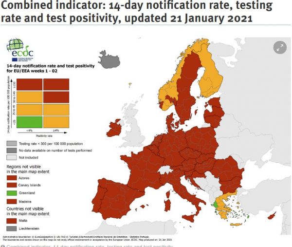 Υπενθυμίζεται ότι οι χάρτες του ECDC ανανεώνονται κάθε Πέμπτη, σύμφωνα με τη Σύσταση του Ευρωπαϊκού Συμβουλίου που έχει ως στόχο την εφαρμογή μιας συντονισμένης προσέγγισης μεταξύ των χωρών της ΕΕ όσον αφορά τον περιορισμό της ελεύθερης κυκλοφορίας για την αντιμετώπιση της πανδημίας.