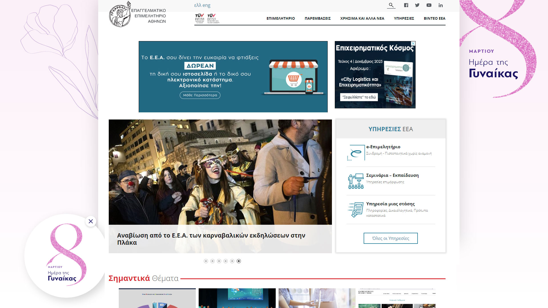 Αύριο, 8 Μαρτίου και για 24 ώρες η εικόνα του site eea.gr αλλάζει χρωματισμό ενώ το απόγευμα της Παρασκευής το κτίριο που στεγάζεται το επιμελητήριο, επί της Πανεπιστημίου 44, θα φωτισθεί σε απόχρωση magenta (κόκκινο-μωβ).