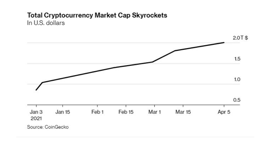 Ξεπέρασε τα 2 τρισ. δολάρια η κεφαλαιοποίηση της αγοράς των κρυπτονομισμάτων, καθώς μέσα σε δύο μήνες διπλασιάστηκε λόγω και της ισχυρής ζήτησης που έχει εκδηλωθεί από τους θεσμικούς επενδυτές.