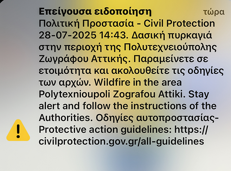 Μήνυμα του 112 για την πυρκαγιά στην περιοχή της Πολυτεχνειούπολης Ζωγράφου, Δευτέρα 28 Ιουλίου 2025.
