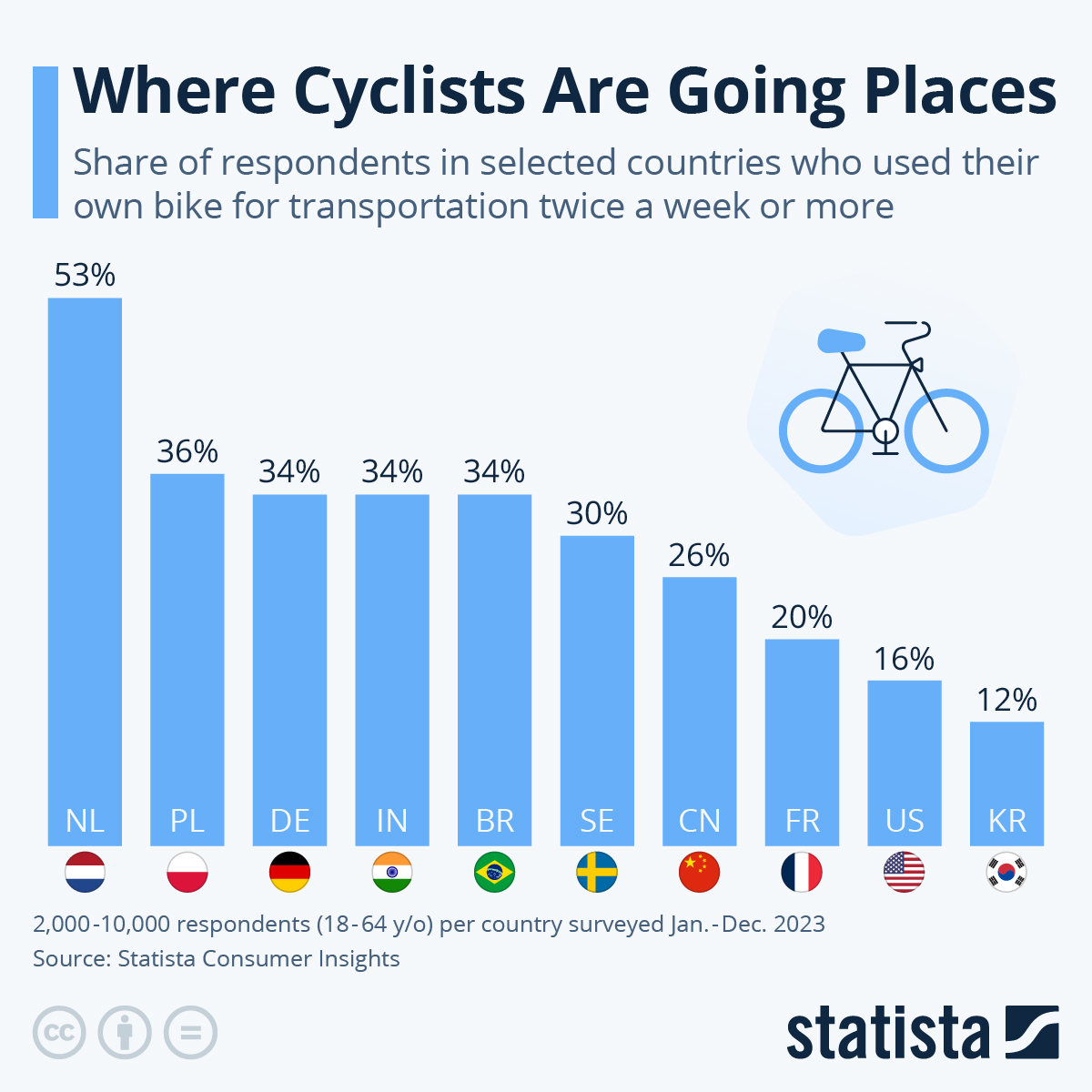 Σύμφωνα με έρευνα του statista.com, εκτός της Ολλανδίας τα κράτη της Ευρώπης πρωταγωνιστούν παγκοσμίως στην προτίμηση των πολιτών για το ποδήλατο, δηλαδή για τη χρήση του ποδηλάτου ως μέσο μεταφορές τουλάχιστον 2 φορές την εβδομάδα,